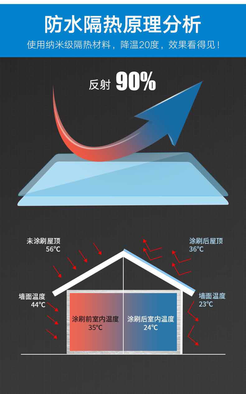 為了解決這些影響舒適人居的建筑難題,雙虹防水材料品牌重磅出擊,自主研發(fā)出一款“防輻射隔熱涂料”,利用防曬原理——在磚塊水泥層的上面加鋪隔熱材料,通過反射日照光線,阻擋熱傳導,從而實現(xiàn)隔熱降溫效果。在人們困擾屋頂?shù)降讉?cè)重做好防水處理還是防曬措施之時,雙虹品牌已經(jīng)完美地融合兩者的優(yōu)勢,防滲水、防潮霉、防暴曬一步到位,加固了安全防線。由46.5℃到32℃的轉(zhuǎn)變能力,能看出雙虹涂料有強勁實力大大降低建筑能耗,從綠色環(huán)保、低碳節(jié)能等層面,提升生活品質(zhì)。