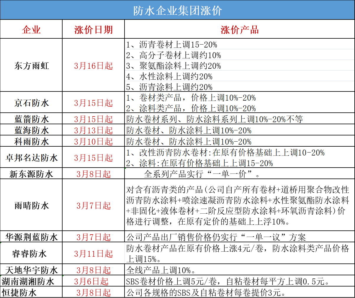 2022年3月,迎來防水行業(yè)局部漲價(jià)潮,據(jù)統(tǒng)計(jì),除“防水龍頭”東方雨虹發(fā)布漲價(jià)函外,京石防水、藍(lán)箭防水、藍(lán)海防水等13家也發(fā)布了官方調(diào)價(jià)函。